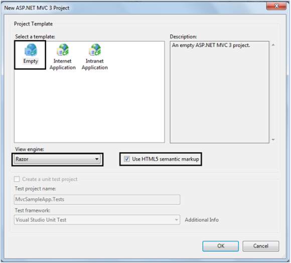 In the New ASP.NET MVC 3 Project dialog box, select Internet Application. Check Use HTML5 markup and leave Razor as the default view engine.