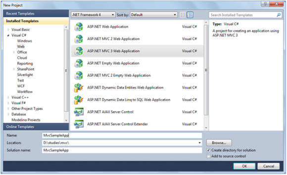 You can create applications using either Visual Basic or Visual C# as the programming language. Select Visual C# on the left and then select ASP.NET MVC 3 for this sample. Name your project "MvcSampleApp" and then click OK.